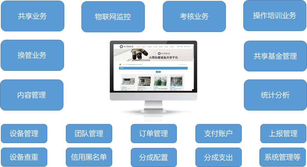 目前學(xué)校的大儀平臺包括大儀共享及設備管控兩大業(yè)務(wù)。其中大儀共享結算直接與學(xué)校財務(wù)系統對接,師生可直接使用校園經(jīng)費卡進(jìn)行預約、使用、結算。同時(shí)支持共享金申請與結算。